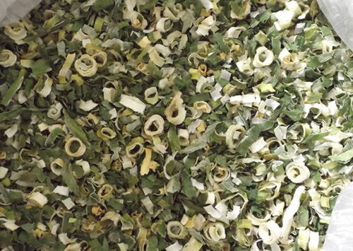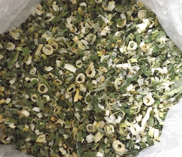 烘干:將甩干的蔥段攤放在烘篩中,裝在烘車(chē)層架上,送入干燥機(jī)烘干。干燥機(jī)在未進(jìn)料前先行預(yù)熱升溫達(dá)60℃左右。烘干溫度控制在58~60℃,烘干時(shí)間6~7小時(shí)。產(chǎn)品含水量降到5%以下。